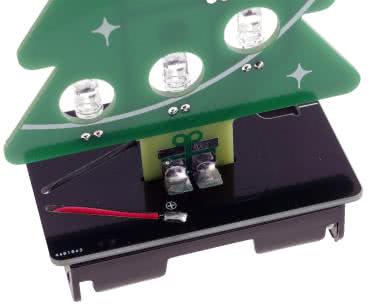 Czarna płytka oprócz funkcji giętarki do wyprowadzeń diod LED spełnia jeszcze jedną bardzo ważną rolę - jest to podstawa naszej choinki i nośnik dla koszyka baterii. Oprócz baterii jest jeszcze rezystor ograniczający prąd niebieskiej diody LED na czubku drzewka. Pozostałe diody nie potrzebują rezystora, ponieważ każda z nich ma wbudowany układ scalony odpowiadający za tworzenie efektu świecy i ograniczenie prądowe. Na płytce znajduje się wyłącznik, którego roli w układzie nie trzeba opisywać.