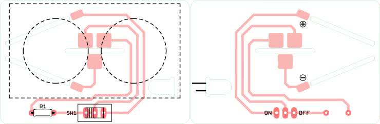 Montaż podstawy rozpoczynamy od rezystora, potem lutujemy przełącznik i ustawiamy suwak w pozycji OFF. Teraz przewody koszyka na baterie należy przełożyć przez podłużne otwory w płytce. Czerwony przewód jest plusem zasilania, a czarny minusem. Po stronie, gdzie znajduje się rezystor i włącznik, naklejamy dwa białe krążki z taśmy dwustronnie klejącej, dzięki którym przykleimy koszyk baterii.