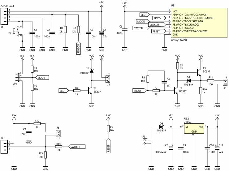 Komunikacja z tym czujnikiem odbywa się poprzez złącze J1. Przycisk S1 służy do ustawiania czułości, kondensator C1 eliminuje wpływ drgania jego styków. Wyjście czujnika jest obciążone rezystorem R1 oraz kondensatorem C2, co zmniejsza możliwość wywołania fałszywego alarmu przez zakłócenia elektromagnetyczne. Gdyby jednak napięcie na tej linii wzrosło powyżej napięcia zasilającego (5 V), to rezystor R2 ograniczy prąd płynący przez wejście mikrokontrolera. Kondensatory C3 i C4 filtrują napięcie zasilające czujnik.