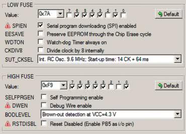 W ramach czynności uruchomieniowych należy ustawić bity zabezpieczające mikrokontrolera ATtiny13: