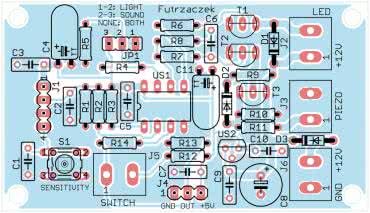 W układzie prototypowym zastosowano przetwornik piezoelektryczny typu KPR 2310-3, który można znaleźć w ofercie sklepu AVT. Jest obudowany osłoną z tworzywa sztucznego, która ułatwia jego przykręcenie w dyskretnym miejscu, ale to nie jedyna jego zaleta. Producent deklaruje częstotliwość rezonansową tego przetwornika na poziomie 4,8 kHz, a to dokładnie pokrywa się z częstotliwością sygnału generowanego przez mikrokontroler do sterowania tymże przetwornikiem. Praca w rezonansie (bądź jego pobliżu) zapewnia najwyższą głośność, dlatego ten typ przetwornika został wybrany do tego układu, choć nic nie stoi na przeszkodzie, by zastosować inny, godząc się na ewentualne zmniejszenie poziomu głośności. Do podłączenia przetwornika przewidziano na płytce złącze J3.