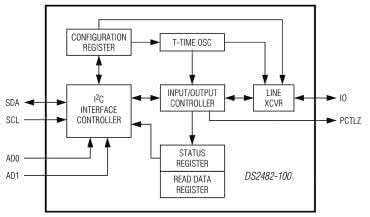 Mostek bazuje na układzie DS2482-100 firmy Analog Devices (dawniej Maxim, a jeszcze dawniej Dallas), którego budowę pokazano na rysunku 1. Układ zawiera kontroler Master 1-Wire współpracujący z magistralą I²C oraz interfejs linii 1W z możliwością programowego aktywnego sterowania podciąganiem magistrali.