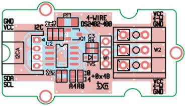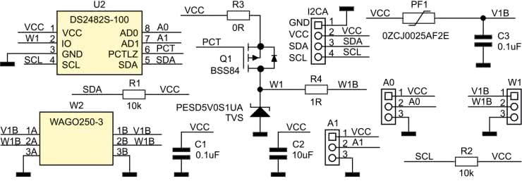Magistrala I²C oraz zasilanie z systemu SBC doprowadzone są do złącza I²C, rezystory R1, R2 podciągają szyny magistrali. 1-Wire wyprowadzono poprzez rezystor szeregowy R4 do złącza szpilkowego W1 oraz sprężynowego W2. Dioda TVS, zabezpiecza magistralę przed skutkami przepięć. Zasilanie magistrali jest zabezpieczone bezpiecznikiem polimerowym PF1.