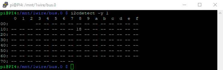 Szybkie sprawdzenie można wykonać przy pomocy Raspberry Pi. Po podłączeniu modułu do magistrali I²C i zasileniu napięciem 3,3 V, używając pakietu i2c-tools, poleceniem i2cdetect -y 1 sprawdzamy obecność układu na magistrali, powinien być obecny pod ustawionym domyślnie adresem 0x18, jak pokazano na rysunku 4.