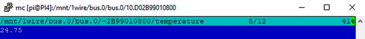 W podkatalogu bus.0 możemy sprawdzić podłączone do DS2482-100 układy 1-Wire. W podkatalogach zaznaczonych na zielono o nazwie identycznej z unikalnym numerem seryjnym ID układu, zapisane są udostępniane parametry. Przykładowo dla DS1820 o ID 10D02B9901080018 z pliku możemy odczytać zmierzoną temperaturę, co widać na rysunku 6.