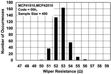 Zworka JP1 służy do ustawiania trybu pracy potencjometru cyfrowego. Jeżeli jest rozwarta, wówczas linia MODE przyjmuje wysoki stan logiczny, co mikrokontroler interpretuje jako konieczność sterowania potencjometrem cyfrowym używając jedynie jego rejestrów: wartość 0 (0x00) odpowiada najniższej pozycji, zaś 255 (0xFF) najwyższej. Jeżeli świat byłby idealny, wówczas ta zworka nie byłaby potrzebna, lecz histogram znajdujący się na rysunku 2 świadczy o tym, że niestety tak nie jest. Na tymże histogramie przedstawiono liczbę układów spośród badanej grupy 400 sztuk, które miały określoną rezystancję ślizgacza. Widać wyraźnie, że przeważająca większość badanych sztuk znalazła się w przedziale 51…54 Ω przy zasilaniu napięciem 5 V.