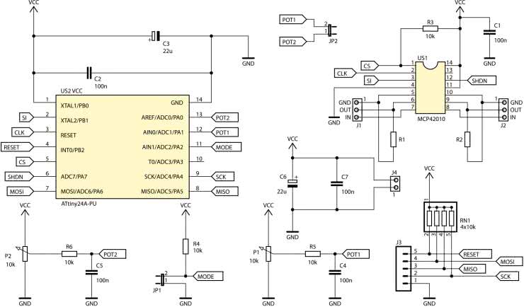 Schemat ideowy układu znajduje się na rysunku 1. Układ US1 typu MCP42010 to półprzewodnikowy, dwukanałowy, ośmiobitowy potencjometr liniowy o rezystancji ścieżek oporowych wynoszącej 10 kΩ. Steruje się nim poprzez interfejs SPI, którym z kolei zarządza mikrokontroler US2 typu ATtiny24A. Rezystor R1 blokuje wejście sygnału zegarowego magistrali SPI w sytuacji, kiedy mikrokontroler nie nadaje. Rezystory R1 i R2 pozwalają na uzyskanie pseudo-logarytmicznej charakterystyki regulacji zamiast liniowej, (co wyjaśnię w dalszej części artykułu). Złącza J1 i J2 są podłączone do wyprowadzeń potencjometrów i opisane tak, jak gdyby sterowany głośnością: