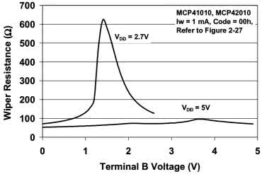 Układ MCP42010 można zasilać napięciem wynoszącym już 2,7 V, lecz nie jest to korzystne z dwóch powodów. Po pierwsze, maksymalne napięcie przyłożone do ślizgacza nie może przekraczać napięcia zasilającego, co ogranicza wartość międzyszczytową sygnału, który chcemy tłumić. Po drugie, rezystancja ślizgacza jest wówczas znacznie wyższa i ulega silnym zmianom w zależności od składowej stałej sygnału - rysunek 5. Dlatego, jeżeli tylko zaistnieje taka możliwość, lepiej byłoby użyć napięcia 5 V do zasilania niniejszego układu.