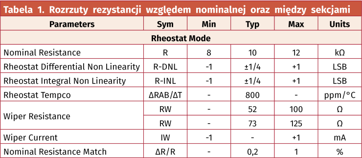 Drugą wadą, która w wielu przypadkach nie jest bardzo dotkliwa, jest wysoki rozrzut rezystancji ścieżki oporowej (R). Faktyczna rezystancja może ulegać rozrzutom aż o 20% względem nominalnej - tabela 1. Natomiast zaletą jest bardzo wysoka współbieżność regulacji, rozrzut między obiema sekcjami nie przekracza 1% (ΔR/R). To bardzo dobry wynik, rzadko spotykany wśród potencjometrów z węglową ścieżką oporową.