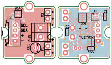 Moduł zmontowany jest na dwustronnej płytce drukowanej o wymiarach 20×20 mm, której schemat został pokazany na rysunku 4. Montaż jest typowy, należy tylko zwrócić uwagę na przylutowanie padu termicznego obudowy U1, dla zapewnienia prawidłowego odprowadzania ciepła i ustawienia adresu I²C zworami A1, A0.