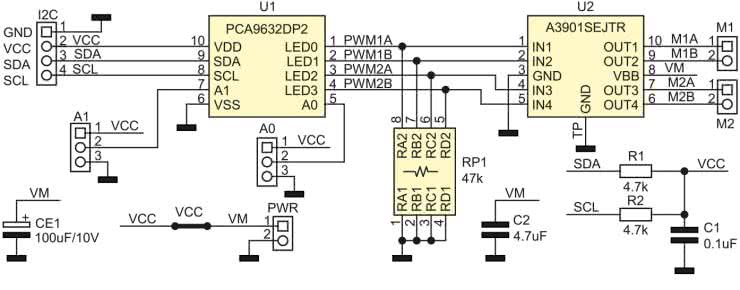 Dla sterowania driverem A3901 zastosowano generator PWM PCA9632 współpracujący z magistralą I²C. Wyprowadzenia adresowe A0, A1 umożliwiają ustawienie 4 adresów, czyli sterowanie do ośmioma mikrosilnikami na jednej magistrali I²C. Zasilanie modułu doprowadzone jest do złącza PWR, zwora VCC umożliwia zasilanie części sterującej napięciem zasilania silników.