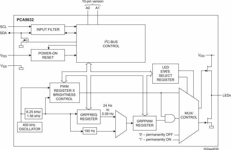 - zawiera generator PWM sterowany z magistrali I²C typu PCA9632,