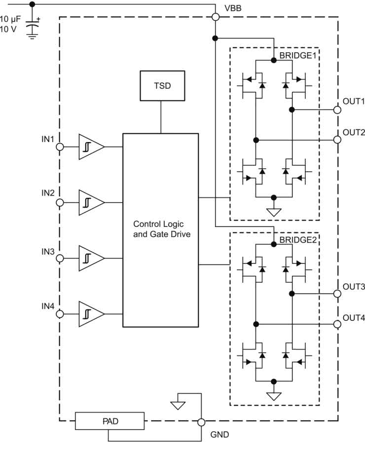 - umożliwia sterowanie dwoma silnikami o prądzie maksymalnym 400 mA zasilanymi napięciem 2,5...5,5 V.