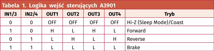 Układ jest wyposażony w zabezpieczenie termiczne. Regulacja prędkości obrotowej może odbywać się sygnałem PWM o częstotliwości do 250 kHz. Kombinacje stanów na wejściach sterujących układu A3901 i odpowiadające im działanie zestawiono w tabeli 1.