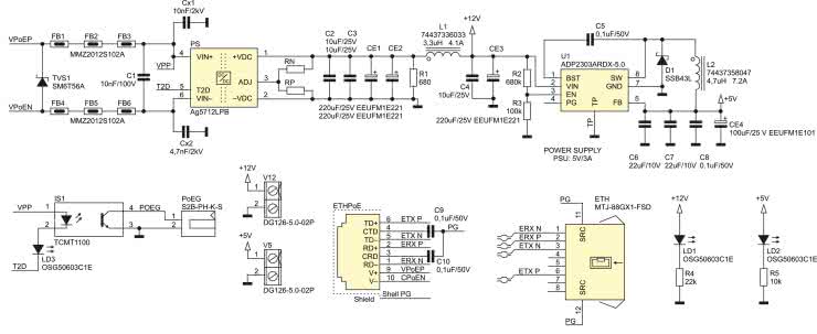 Schemat zasilacza przedstawiono na rysunku 2. Zasilanie z routera, switcha lub inżektora PoE+ wraz z sygnałami transmisji doprowadzone jest typowym okablowaniem Cat5 do gniazda ETHPoE. Same przebiegi cyfrowe nie podlegają żadnym modyfikacjom i są bezpośrednio wyprowadzone na gniazdo ETH, które należy połączyć z interfejsem sieciowym urządzenia (lub pozostawić niepodłączone, jeżeli używamy tylko trybu zasilania). Modułowe gniazdo ETHPoE typu WE 7498210002 wyposażone jest w transformatory separacyjne dla kanałów transmisji RX/TX oraz dwa mostki prostownicze umożliwiające zastosowanie obu schematów transmisji zasilania, zarówno przez pary sygnałowe, jak i przez pary niewykorzystane w interfejsie 100M. Zasilanie z PoE+ – po zabezpieczeniu przez transil TVS1 i dodatkowej filtracji zakłóceń poprzez FB1...FB6 – doprowadzone zostaje do modułu PS. Wyjście T2D służy do sygnalizacji typu współpracującego PSE. Jeżeli moduł podłączony został do PSE zgodnego z PoE+, T2D ustawiane jest w stan niski (co sygnalizuje tym samym dostępność pełnej mocy modułu). Transoptor IS1 separuje sygnał od potencjału pierwotnej strony przetwornicy, zaś dioda LD3 sygnalizuje zgodność z PoE+. Jeżeli PSE jest niezgodne z PoE+, wówczas wyjście T2D ustawiane zostaje w stan wysoki, jednocześnie informując współpracujący układ o ograniczeniu dostępnej mocy do 12 W. Sygnał POEG dostępny jest na złączu PoEG. Rezystory RN, RP służą do korekcji napięcia wyjściowego przetwornicy, zgodnie z notą aplikacyjną.