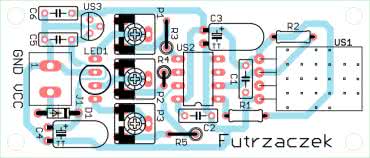 Układ został zmontowany na jednostronnej płytce drukowanej o wymiarach 30 mm × 70 mm. Jej wzór ścieżek oraz schemat montażowy przedstawia rysunek 2. W odległości 3 mm od krawędzi płytki znalazły się cztery otwory montażowe, każdy o średnicy 3,2 mm.