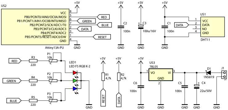 Przedział wartości, w którym znajduje się aktualnie zmierzona wilgotność powietrza, wskazywany jest poprzez załączenie jednej z trzech struktur wchodzących w skład trójkolorowej diody LED1 o wspólnej katodzie. Prąd każdej ze struktur jest ograniczony przez szeregowe połączenie rezystora 220 Ω i potencjometru, którego rezystancję można regulować w zakresie 0…10 kΩ. Wybrano takie rozwiązanie, ponieważ umożliwia proste i wygodne ustalenie pożądanej jasności każdej z barw, które są przez nasz wzrok interpretowane z różną intensywnością.