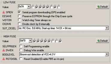 Szczegóły są widoczne na rysunku 3, który zawiera widok okna konfiguracji tychże bitów z programu BitBurner. W ten sposób zostanie wyłączony preskaler sygnału zegarowego oraz włączy się Brown-Out Detector, który wprowadzi mikrokontroler w stan zerowania, jeżeli jego napięcie zasilające spadnie poniżej 4,3 V. Taka procedura znacznie zmniejsza ryzyko zawieszenia się układu podczas uruchamiania.