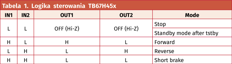 Pełne sterowanie mostkiem umożliwia uzyskanie czterech stanów pracy: obroty w przód, tył, hamowanie i zatrzymanie wirnika. Logikę sterowania wyprowadzeń IN1,2 zaprezentowano w tabeli 1.