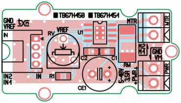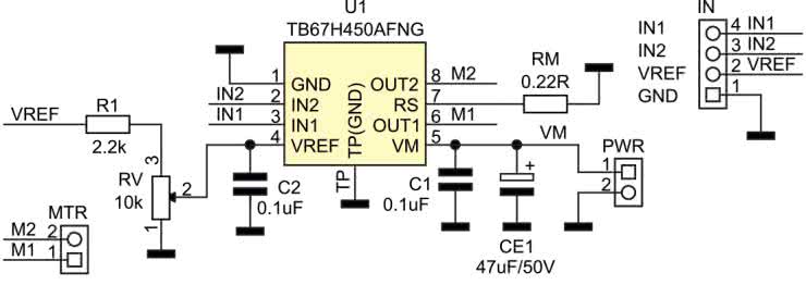 Aplikacja TB67H45x okazuje się bardzo prosta: moduł zasilany jest napięciem stałym ze złącza PWR, odsprzęganym przez CE1, C1. Silnik podłączony jest do złącza MTR, natomiast sterowanie i napięcie VREF – do złącza IN. W modelu domyślnie wybrany jest tryb Chopper, co wymaga montażu odpowiednio obliczonego RM; prąd ograniczenia ustalony został na ok. 1,8 A (Vref=5 V, RM=0,22 Ω). Potencjometr RV umożliwia zmniejszenie prądu maksymalnego.