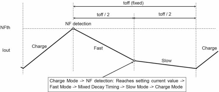 W pierwszej fazie mostek H załącza prąd na uzwojenie, aż do momentu osiągnięcia detekcji ustalonego prądu (NFth). W drugiej fazie silnik hamowany jest przeciwprądem (fast decay), natomiast na trzecim etapie – prądem zwarcia (slow decay). Czas trwania drugiej i trzeciej fazy sterowania jest ustalony na 25 μs z 50-procentowym podziałem pomiędzy fazę drugą i trzecią. Jeżeli podczas drugiej fazy prąd zaniknie (I=0), wyjścia mostka ustawiane są w stan wysokiej impedancji.