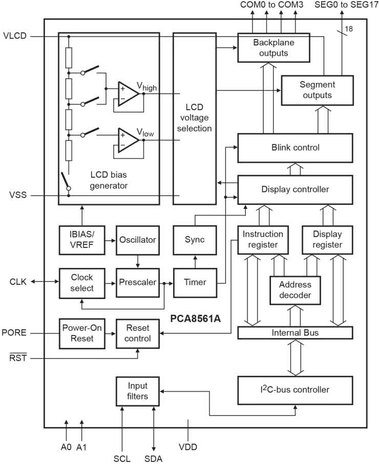 PCF8561A zawiera układ drivera i polaryzacji wyświetlacza LCD pracującego w trybie multipleksowym, umożliwiając wysterowanie do 18 segmentów (SEG) z maksymalnie czterema elektrodami wspólnymi (COM). Układ obsługuje tryb statyczny i multipleksowany 1:2/3/4 wraz z generowaniem napięcia zasilającego elektrody wspólne. PCA8561A ma wbudowany generator taktujący, układ resetu POR, rejestry pamięci przechowujące kształt wyświetlanego znaku oraz – oczywiście – kontroler interfejsu I²C 400 kHz. Dostępna jest też wersja PCA8561B z łączem SPI.