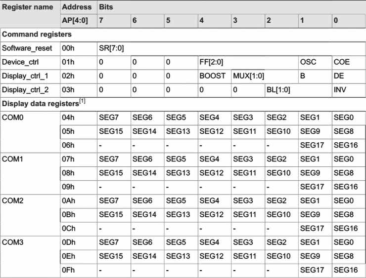 Sterowanie wyświetlaczem odbywa się poprzez rejestry układu PCA8561A, mapę rejestrów pokazano na rysunku 4.
