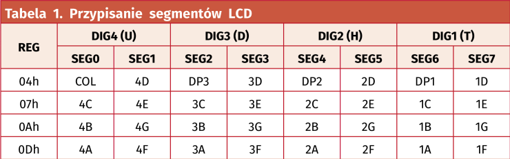 Do sterowania segmentami LCD użyte zostały rejestry COM0..3, w związku z użyciem wyprowadzeń SEG0..7, aktywne są tylko rejestry pod adresami 0x04, 0x07, 0x0A, 0x0D. Przypisanie fizycznych segmentów LCD pokazano w tabeli 1.
