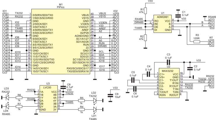 Schemat modułu pokazano na rysunku 1. Płytka zawiera drivery portów komunikacyjnych w standardach RS232 i RS485. Układ U1 typu ADM3061 obsługuje komunikację RS485 w trybie half-duplex z prędkością maksymalną 500 kbps, zapewniając przy tym pełne zabezpieczenie przed zwarciem, rozwarciem magistrali i skutkami przepięć. Układ zasilany jest napięciem 3,3 V, generowanym przez Raspberry Pi Pico i korzysta z UART1 (GPIO4,5) oraz GPIO22 (DIR485) do sterowania kierunkiem transmisji, natomiast bramki U3 buforują diody LD1,4 sygnalizujące stany na liniach komunikacji TX485/RX485. Z kolei układ U2 typu MAX3232 obsługuje komunikację RS232 i używa UART0 (GPIO0,1), zaś pozostałe bramki układu U3 buforują diody LD2,3 sygnalizujące stany sygnałów komunikacji TX232/RX232.