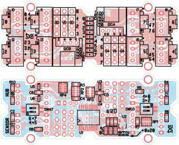 Grove_SensorHUB zmontowany jest na dwustronnej płytce drukowanej mechanicznie zgodnej ze standardem Grove – rozmieszczenie elementów zaprezentowano na rysunkach 2 a i 2b. Montaż jest typowy i nie wymaga szczegółowego opisu, a sam układ nie narzuca konieczności specjalnego uruchamiania – należy tylko ustalić położenie zwór adresowych. Adres bazowy koncentratora to 0x20, gdy wszystkie zwory są zalutowane w położeniach „0”. Gotowy układ pokazuje fotografia tytułowa.