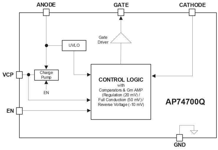 W modelu został zastosowany układ kontrolera diody idealnej typu AP74700 (Diodes Inc). Spełnia on wszystkie wymogi stawiane opisanej aplikacji, a jednocześnie pozwala zachować prostotę układu i zminimalizować koszty implementacji. Schemat wewnętrzny układu AP74700 pokazano na rysunku 1, natomiast schemat modułu – na rysunku 2.
