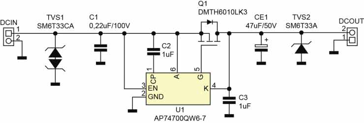Opracowany moduł bazuje na kontrolerze pojedynczej diody idealnej U1 typu AP74700, odpowiadającym za detekcję obecności napięcia wejściowego oraz prawidłowe sterowanie zewnętrznego tranzystora kluczującego MOSFET, w zależności od różnicy napięć na wyprowadzeniach Anode/Cathode. Napięcie wejściowe z akumulatora, zasilacza lub panelu PV doprowadzone zostało do złącza DCIN, skąd jest kluczowane na wyjście DCOUT. Tranzystor MOSFET Q1 typu DMTH6010 (Rdson <12 mΩ) charakteryzuje się bardzo niskim spadkiem napięcia w kierunku przewodzenia: w zależności od warunków pracy nie przekracza ono 50 mV, co znacząco ogranicza straty mocy, w porównaniu z diodą Schottky’ego (nie wspominając już o zwykłej diodzie prostowniczej). Diody TVS1,2 służą do zabezpieczenia układu przed skutkami przepięć. Kondensator CE1 jest magazynem energii niezbędnym do podtrzymania zasilania układu podczas przełączania kilku źródeł energii przy pracy w układzie typu OR-ring. W opisywanym module pojemność CE1 przyjmuje minimalną wartość niezbędną do poprawnej pracy układu, choć w praktyce może ona zostać dobrana z zakresu 22...220 μF/50 V. Aby poprawnie spełniać funkcję magazynu, CE1 musi mieć niską rezystancję ESR. Układ U1 wyposażony jest w zabezpieczenie przed uszkodzeniem w przypadku odwrotnego podłączenia zasilania, a dodatkowo odcięcie Q1 chroni także podłączone obciążenie.