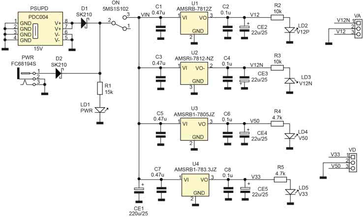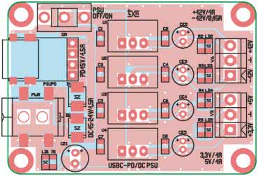 Układ oparty jest na scalonych przetwornicach U1…4 typu AMSRx o ustalonych napięciach wyjściowych. Dzięki zastosowaniu przetwornic możliwe jest uzyskanie niewielkich wymiarów zasilacza oraz wysokiej sprawności (w porównaniu do klasycznych stabilizatorów 78xx/79xx). W celu uzyskania napięcia –12 V zastosowana została przetwornica obniżająco-odwracająca AMSRI. Napięcie zasilania przetwornic może być doprowadzone do gniazda PWR 5,5/2,5 mm, a jego wartość powinna zawierać się w granicach 15...20 V – jako źródło zasilania układu może zatem posłużyć typowy zasilacz laptopa (wyposażony w odpowiedni adapter), który zalega zapewne w zakamarkach każdego warsztatu. Można w ten sposób dać drugie życie potencjalnemu elektrośmieciowi i stać się czynnym uczestnikiem ruchu „up-cyclingu”. Drugim sposobem zasilania jest zastosowanie typowej ładowarki USB-C PD o napięciu 15 V i mocy minimalnej 25 W. Aby ułatwić sobie zadanie, w zasilaczu użyto gotowego modułu wyzwalacza PD (o napięciu wyjściowym 15 V) typu PDC-004. Moduł jest łatwo dostępny na portalach aukcyjnych, w cenie kilku...kilkunastu PLN. Oczywiście można było zastosować któryś z układów wyzwalacza, np. IP2712 lub CHK22x, jednak ich cena i dostępność w ilościach jednostkowych jest dyskusyjna. Diody D1,2 zabezpieczają zasilacze przed zwarciem ich wyjść przy pomyłkowym równoczesnym podłączeniu obu źródeł. Wyłącznik ON umożliwia odłączenie zasilania przetwornic na czas manipulacji w zasilanym układzie. Diody LED LD1…5 sygnalizują obecność napięcia zasilania oraz napięć wyjściowych.