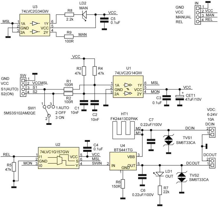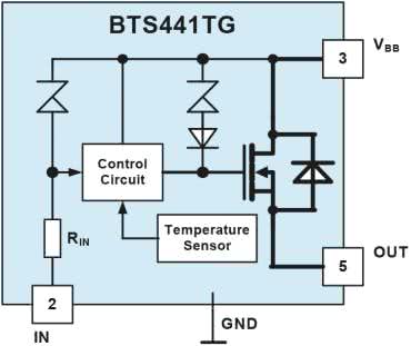 Schemat wewnętrzny układu BTS441TG pokazano na rysunku 1, zaś schemat ideowy modułu widnieje na rysunku 2. Klucz U4 BTS441TG sterowany jest sygnałem REL ze złącza IN, doprowadzonym do multipleksera U2 typu LVC1G157. Zadanie multipleksera polega na wyborze pomiędzy trybami pracy przekaźnika: AUTO (gdy sterowany jest poziomem logicznym sygnału REL) – lub pracą ze sterowaniem ręcznym ON/OFF (gdy sterowany jest za pomocą przełącznika SW1). Wybór trybu określa sygnał MSL: jeżeli przełącznik SW1 znajduje się w położeniu AUTO, stan sygnału MSL jest wysoki, co wybiera wejście I1 i sterowanie sygnałem REL. W przypadku gdy przełącznik SW1 znajduje się w położeniu ON lub OFF, sygnał MSL jest w stanie niskim, wybrane jest wejście I0 multipleksera U2 i przekaźnikiem steruje sygnał MON zależny od pozycji ON/OFF przełącznika SW1.