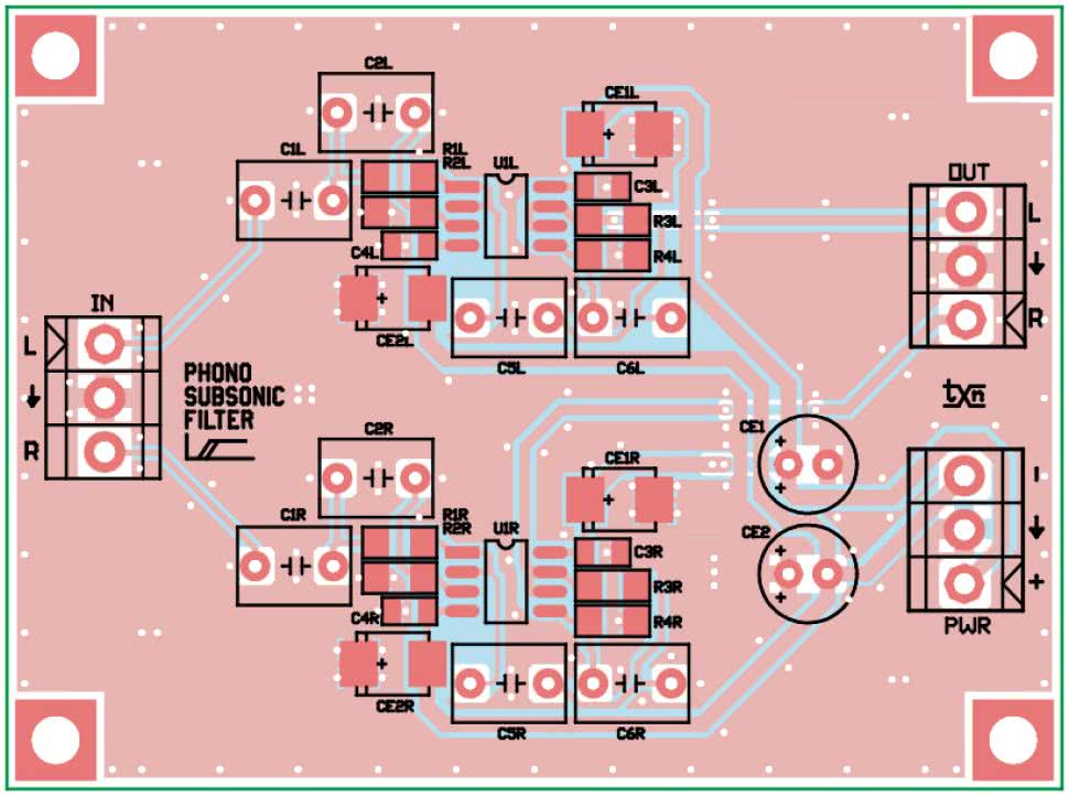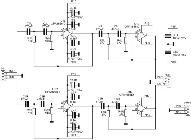 Sygnał wejściowy z gniazda IN doprowadzony zostaje do dwustopniowego filtra górnoprzepustowego Butterwortha. Kaskadowe połączenie filtrów drugiego rzędu pozwala na znaczące zwiększenie skuteczności filtracji (do 2×12 dB/oktawę), przy ograniczeniu wpływu na zakres częstotliwości użytecznych. W celu minimalizacji przesłuchów stereo każdy kanał używa niezależnego, nowoczesnego, szybkiego i niskoszumowego wzmacniacza operacyjnego U1L/R typu OPA1656. Filtry górnoprzepustowe korzystają z topologii Sallena-Keya ze wzmocnieniem jednostkowym. Dobór elementów – zamiast drogą żmudnych obliczeń – został przeprowadzony za pomocą symulatora filtrów Analog Filter Wizard (https://tools.analog.com/en/filterwizard/). W materiałach dodatkowych załączono przykładowe projekty dla częstotliwości 5...20 Hz, które można zoptymalizować na potrzeby własnego zastosowania. W układzie filtra założono stałą, typową i łatwo dostępną wartość pojemności kondensatorów C1/2LR, C5/6LR=470 nF i zmienianą w zależności od częstotliwości wartość rezystorów R1/2LR, R3/4LR. Wartości rezystorów stanowią kompromis pomiędzy impedancją wejściową filtra a poziomem szumów. Minimalna impedancja wejściowa filtra wynosi ok. 20 kΩ, co nie stanowi problemu dla dzisiejszych przedwzmacniaczy gramofonowych lub wyjść sygnału audio. Problematyczne mogą być tylko przedwzmacniacze lampowe o wyższych wartościach impedancji wyjściowej, w takim przypadku warto zastosować dodatkowy bufor.