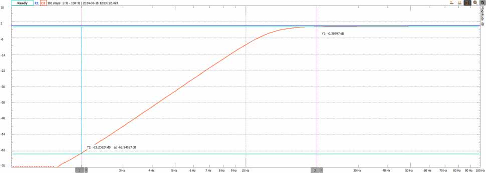 Układ nie wymaga uruchamiania, działa natychmiast po zlutowaniu (przy założeniu, że wszystkie elementy są sprawne) i włączeniu zasilania. W zależności od zastosowania, filtr umieszczamy po przedwzmacniaczu gramofonowym lub na wejściu subwoofera. Istnieją różne podejścia do kwestii wyłączania filtra; ja jestem zwolennikiem włączenia go w tor audio na stałe, bez dodatkowych przełączników by-pass. Wprowadzony uszczerbek w jakości dźwięku okazuje się znacznie mniej dokuczliwy niż modulacja membran głośników niskimi częstotliwościami lub uszkodzenie przeciążonego mechanicznie głośnika drogiego subwoofera. Filtr można też zmontować w wersji monofonicznej, ale z elementami dobranymi dla różnych częstotliwości filtracji, np. 5/12 Hz i przełączać je w zależności od potrzeb. Przykładowy pomiar charakterystyki filtru wykonany za pomocą urządzenia Analog Discovery3 ukazano na rysunku 3.