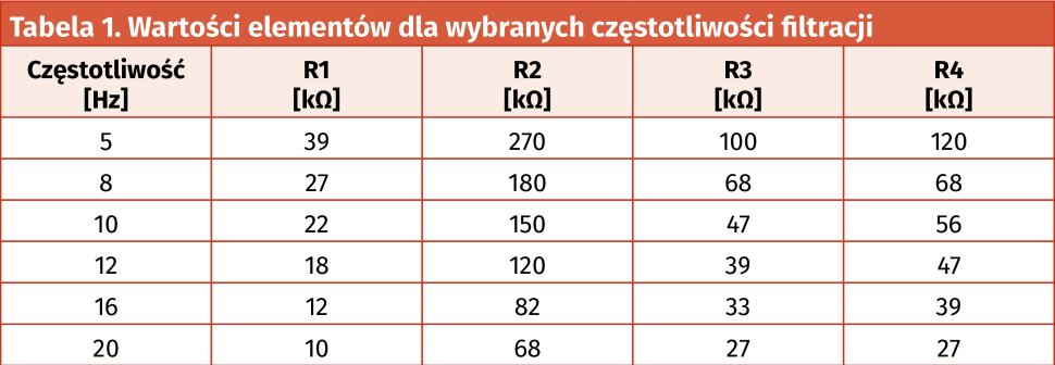 W zależności od doboru elementów można uzyskać różne częstotliwości odcięcia. Przykładowe wartości elementów dla kilku typowych częstotliwości filtracji zebrano w tabeli 1.