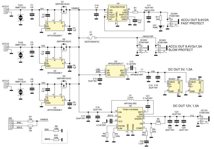 Pierwszy z wymienionych podsystemów oparty jest na sterownikach diody idealnej AP74700W, współpracujących z tranzystorami kluczującymi MOSFET o niskiej rezystancji Rds w stanie przewodzenia. Każdy z trzech akumulatorów, podłączonych do odpowiadającego im złącza spośród ACCU1..3, współpracuje z własnym kontrolerem diody idealnej U1..3. Wyjścia wszystkich trzech kontrolerów połączone są równolegle w pierścień OR-Ring zasilający szynę V84BUS. Kontrolery umożliwiają bezprzerwowe zasilanie obciążenia podczas wymiany akumulatora, o ile oczywiście podłączony jest chociaż jeden z nich.
