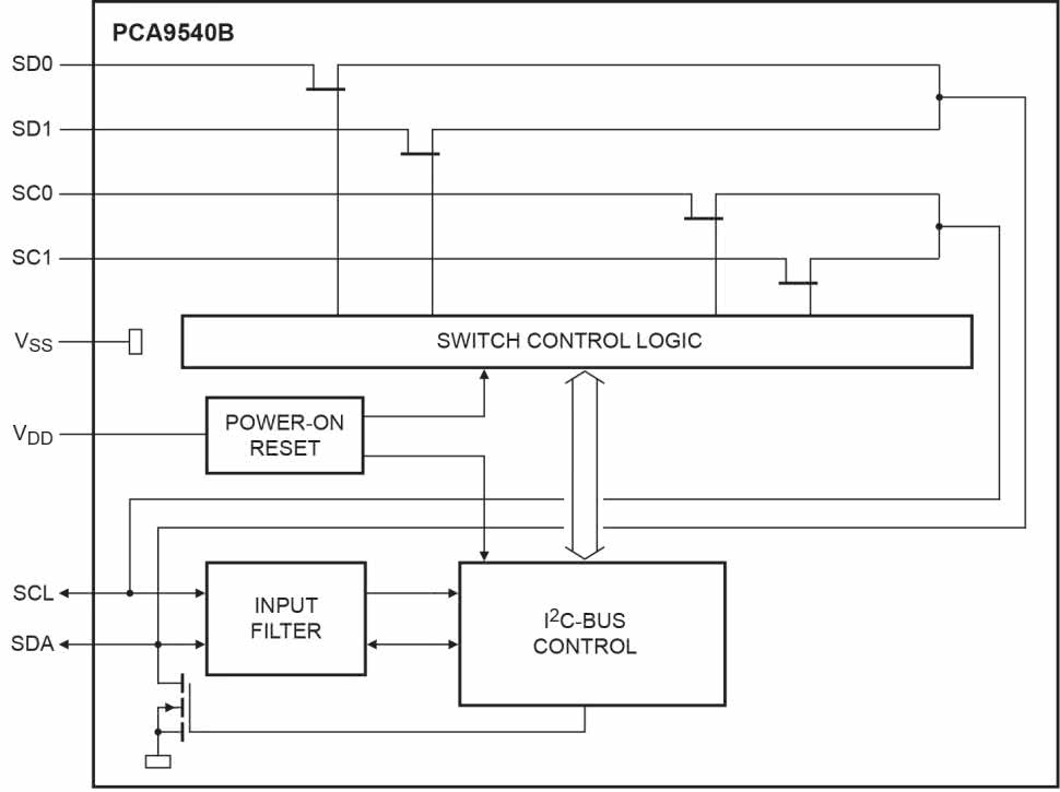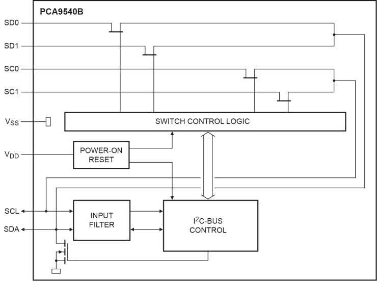 Moduł bazuje na scalonym multiplekserze magistrali I²C typu PCA9540B, którego schemat wewnętrzny pokazano na rysunku 1. Aktywny spośród dwóch dostępnych kanałów wybierany jest poprzez bezpośrednią konfigurację rejestru 0x70 magistrali I²C, a więc układ nie wymaga przy tym stosowania dodatkowych wyprowadzeń sterujących.
