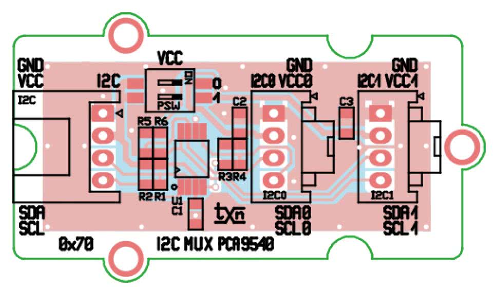 Obsługa modułu odbywa się programowo – PCA9540B widoczny jest na magistrali pod adresem 0x70 i ma tylko jeden rejestr konfiguracyjny, który można odczytywać i zapisywać. Domyślnie po włączeniu zasilania obie magistrale wyjściowe pozostają odłączone, a rejestr 0x70 jest zainicjalizowany wartością 0x00. Zapis bajtu 0x04 wybiera magistralę I2C0, a – 0x05 magistralę I2C1. Zapis dowolnej z pozostałych wartości wyłącza obie magistrale.
