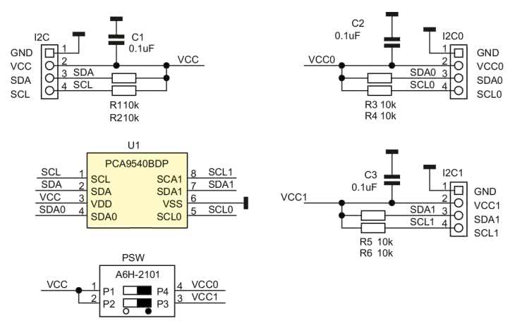 Schemat ideowy modułu pokazano na rysunku 2. Sygnały magistrali I²C wraz z zasilaniem doprowadzone są do złącza I²C. Dwa kanały wyjściowe multipleksera wyprowadzono na złącza I2C0, I2C1. Rezystory R1...R6 podciągają wstępnie sygnały magistral do linii zasilania, ich wartość można zoptymalizować w zależności od docelowego napięcia zasilania układu. Przełącznik DIP (PSB) umożliwia odcięcie zasilania VCC od napięć VCC0, VCC1, wyprowadzonych na złącza I2C0, I2C1. Jest to przydatne, gdy układy po stronie wyjściowej multipleksera mają własne zasilanie (napięciem takim samym lub o innej wartości niż napięcie modułu). W zwartej pozycji PSM do złączy I2C0, I2C1 doprowadzone jest zasilanie pierwotnej strony multipleksera.