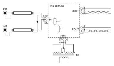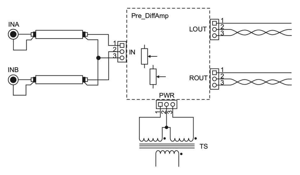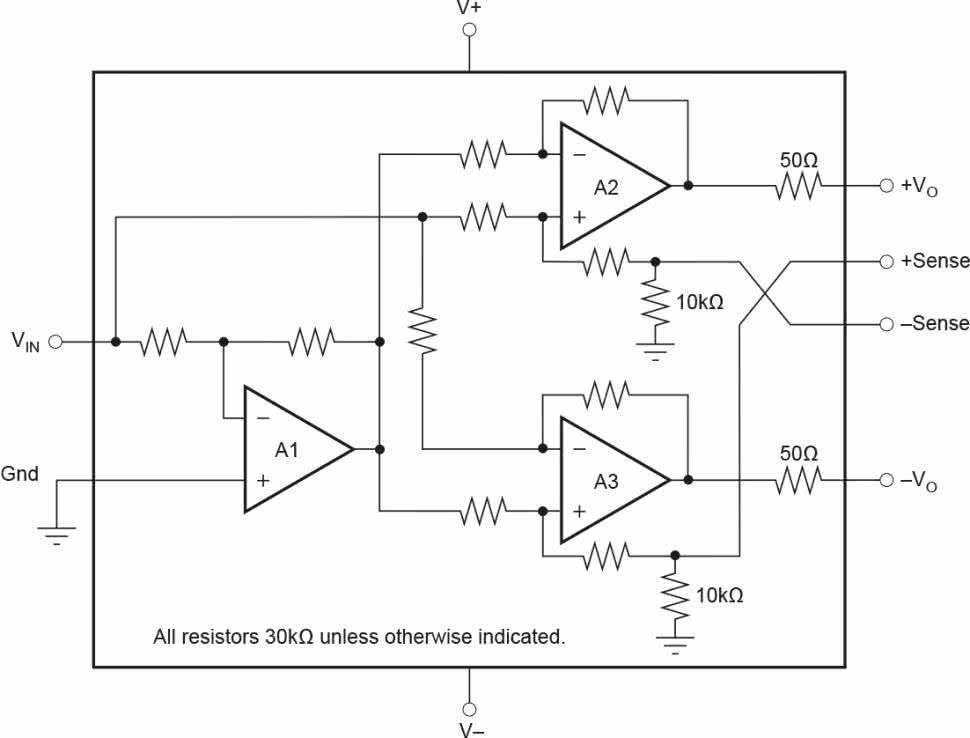 W układzie zastosowano specjalizowane nadajniki linii symetrycznej DRV134 firmy Texas Instruments (zamiennikami są wycofane, ale jeszcze dostępne SSM2142 oraz wciąż produkowane THAT1646). Niesymetryczny sygnał audio trafia ze złącza IN poprzez potencjometr RV1 (odpowiedzialny za regulację poziomu) do układów U1L/R, w których odbywa się symetryzacja sygnału. Strukturę wewnętrzną DRV134 pokazano schematycznie na rysunku 2. Dzięki kalibracji rezystorów w obwodach odwracaczy nie trzeba martwić się o błąd symetrii sygnału. Duża wydajność prądowa, odporność na zwarcia wyjścia oraz możliwość pracy z silnymi sygnałami wejściowymi i wyjściowymi idealnie pasują do zastosowania opisywanego układu w roli odwracacza/symetryzatora oraz przedwzmacniacza sterującego symetrycznym wejściem końcówki mocy.