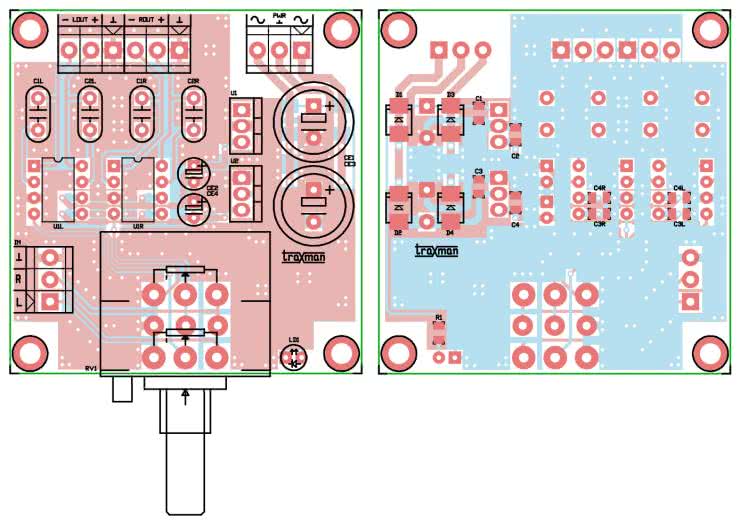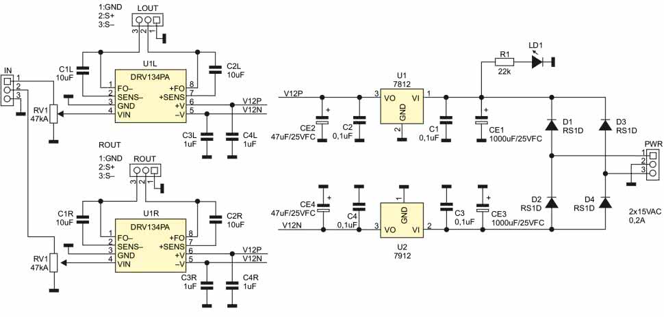 Symetryczny sygnał wyjściowy doprowadzony jest do złączy L/ROUT. Układ uzupełnia typowy zasilacz symetryczny ±12 V. Zasilające napięcie zmienne ze złącza PWR prostowane jest szybkim mostkiem prostowniczym, filtrowane kondensatorami o niskim ESR i stabilizowane przez LDO U1/U2. Pozostałe kondensatory odsprzęgają napięcia zasilania, LD1 sygnalizuje jego obecność. Do zasilania układu wystarcza niewielki transformator 2×12 V/min. o obciążalności min. 0,2 A i mocy 6...8 VA. Jeżeli zależy nam na uzyskaniu maksymalnego poziomu wyjściowego, można zasilacz ±12 V zastąpić zasilaczem ±15 V poprzez wymianę stabilizatorów na parę układów 7815/7915, wyposażonych w niewielkie radiatory, podniesienie napięć pracy kondensatorów CE1/3 do 35 V oraz zasilenie układu napięciem 2×18 V (AC).