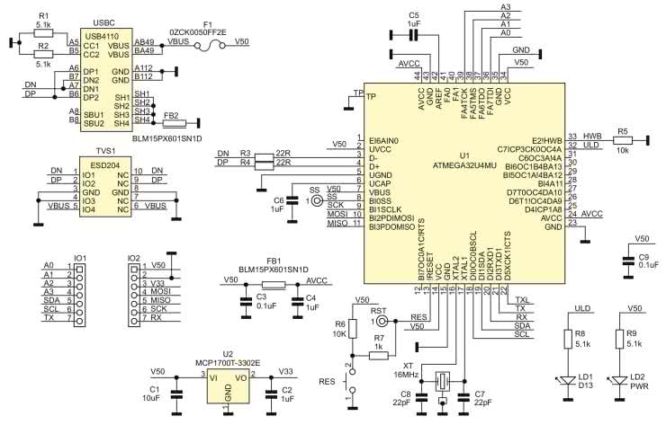 Komunikacja i zasilanie modułu odbywa się poprzez gniazdo USBC. Układ TVS1 zabezpiecza interfejs przed skutkami przepięć, a bezpiecznik polimerowy F1 (500 mA) przed skutkami zwarcia w prototypowanym układzie. Układ zasilany jest napięciem 5 V z interfejsu USBC, zasilanie dla części analogowej dodatkowo filtrowane jest przez C3, C4, FB2. Z napięcia 5 V zasilany jest też pomocniczy stabilizator LDO 3,3 V w postaci układu U2 typu MCP1700. Dioda LD2 sygnalizuje obecność zasilania. Moduł wyposażony jest tylko w przycisk RES (RESET) oraz diodę użytkownika LD1. Sygnały interfejsów zgodne z XIAO wyprowadzone są na złącza IO1, IO2. Dodatkowo przewidziano pady udostępniające sygnały SS magistrali SPI oraz RST (RESET), pomocne przy programowaniu poprzez ISP, co zwiększa nieco długość modułu. Układ, oprócz przycisku RES, ma także dedykowany rezystor R5, umożliwiający (po jego zwarciu) uaktywnienie wbudowanego bootloadera, jeżeli taka opcja zostanie wybrana przy programowaniu fusebitów.