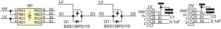 Schemat układu pokazano na rysunku 1. Aktywna część składa się z zaledwie dwóch elementów: podwójnego tranzystora Q1 typu BSS138 oraz drabinki rezystorowej RP. Kondensatory C1, C2 zapewniają dodatkowe odsprzęganie zasilania pomiędzy współpracującymi układami zewnętrznymi. Zasada działania została opisana w nocie aplikacyjnej AN10441 firmy NXP, dostępnej online.
