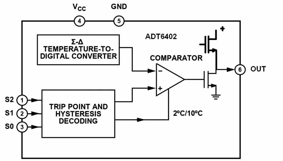 Budowę wewnętrzną ADT6402 pokazano na rysunku 1. Sygnał z wbudowanego przetwornika temperatury przetwarzany jest na wartość cyfrową i porównywany w komparatorze z wartościami ustawionymi za pomocą wyprowadzeń S0...S2. W zależności od potrzeb możliwe jest wybranie kilku progów temperatury i dwóch progów histerezy zadziałania. Na wyjściu układu, po spełnieniu warunków zadziałania, pojawia się stan wysoki. W modelu wybrano sygnalizację spadku temperatury poniżej 5°C z histerezą 2°C, co pozwala na wcześniejsze ostrzeżenie przed ryzykiem zamrożenia.