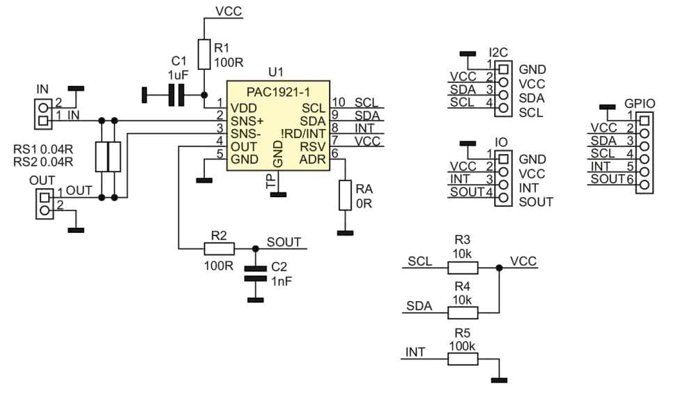 Schemat układu zaprezentowano na rysunku 2. Źródło napięcia doprowadzone jest do złącza IN. Wartość napięcia mierzona jest bezpośrednio na wyprowadzeniu SENSE+, zaś pomiar prądu odbywa się pośrednio, poprzez monitorowanie spadku napięcia na rezystorach RS1 i RS2 podłączonych do wyprowadzeń SENSE+/–. Obciążenie należy podłączyć do wyjścia OUT. Rezystory pomiarowe RS1/2 (o wartości 40 mΩ/1 W) połączone są równolegle i umożliwiają pomiar prądu w maksymalnym zakresie 0...5 A. Magistrala I²C i zasilanie doprowadzone są do złącza I²C, rezystory R3,4 podciągają linie SDA i SCL do dodatniej szyny zasilania. Do złącza IO doprowadzono sygnały sterowania trybem pracy INT oraz – po dodatkowej filtracji R2/C2 – napięcie SOUT z wbudowanego przetwornika D/A. Sygnały powielone są na złączu SIP GPIO. Układ pracuje poprawnie z zasilaniem 3...5 V, pobór prądu nie przekracza 1 mA.