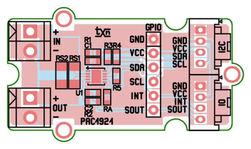 Układ zmontowano na dwustronnej płytce drukowanej zgodnej mechanicznie i elektrycznie z formatem Grove. Rozmieszczenie elementów na PCB pokazano na rysunku 3.