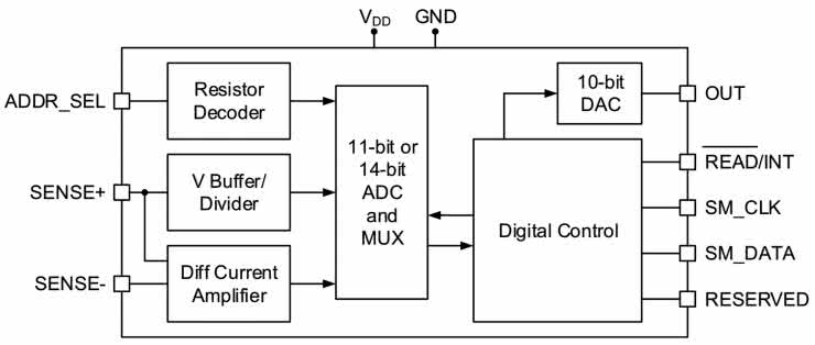 Pomiar odbywa się po stronie zasilania (tryb high–side). Napięcie jest mierzone bezpośrednio na wyprowadzeniu SENSE+, w zakresie 0...32 V z możliwością programowego ustalenia dodatkowego wzmocnienia (×1, ×2, ×4, ×8, ×32). Prąd mierzony jest metodą pośrednią poprzez pomiar spadku napięcia na rezystorze bocznikowym, podłączonym pomiędzy wyprowadzenia SENSE+/– wbudowanego wzmacniacza różnicowego. Maksymalny zakres mierzonego spadku napięcia Vsense to 100 mV. Wbudowany wzmacniacz o programowanym w ośmiu stopniach wzmocnieniu (×1, ×2, ×4, ×8, ×16, ×32, ×64, ×128) umożliwia realizację zmiany zakresów bez konieczności stosowania dodatkowych elementów zewnętrznych. Oba tory wzmocnienia sygnalizują przekroczenie zakresu poprzez ustawienie odpowiednich flag w rejestrach, co ułatwia programową obsługę zmiany wzmocnienia.