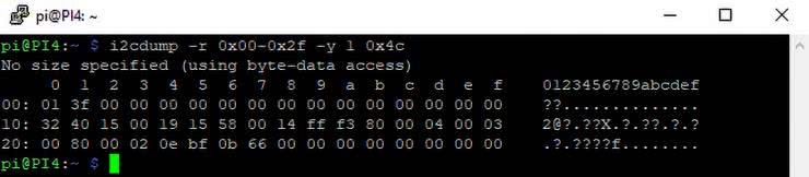 W celu szybkiego sprawdzenia działania modułu można użyć narzędzi i2ctools. Po podłączeniu zasilania do złącza IN i obciążenia do złącza OUT sprawdzamy detekcję układu na magistrali poleceniem i2cdetect –y 1. Moduł powinien być widoczny pod ustalonym przez RA adresem.